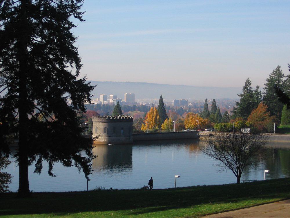 Looking down towards Portland’s city center from Mt. Tabor’s reservoir