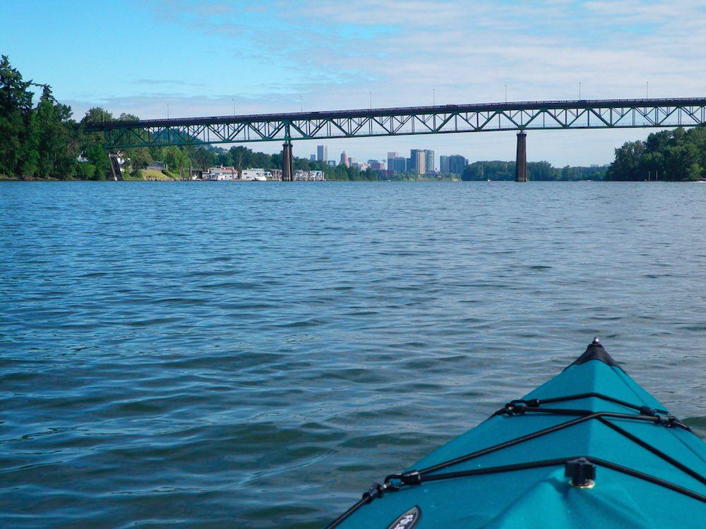 A view of Downtown Portland and the old Sellwood Bridge from the Willamette River